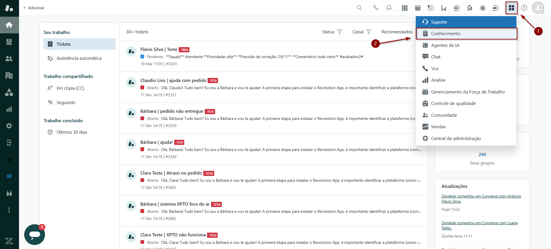 1) Após acessar a interface da Zendesk, clique no ícone de Produtos Zendesk e selecione a opção Conhecimento.
