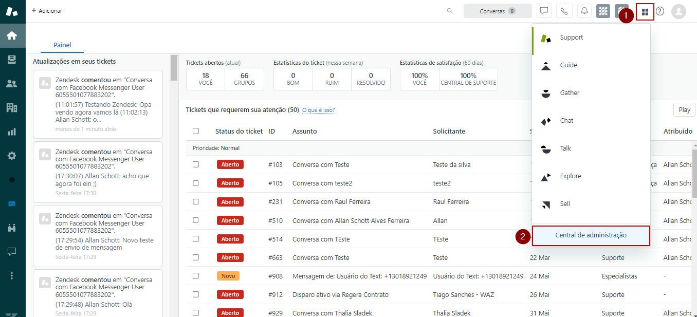 1) Na interface da Zendesk, acesse a Guia de Produtos Zendesk e selecione Central de administração.