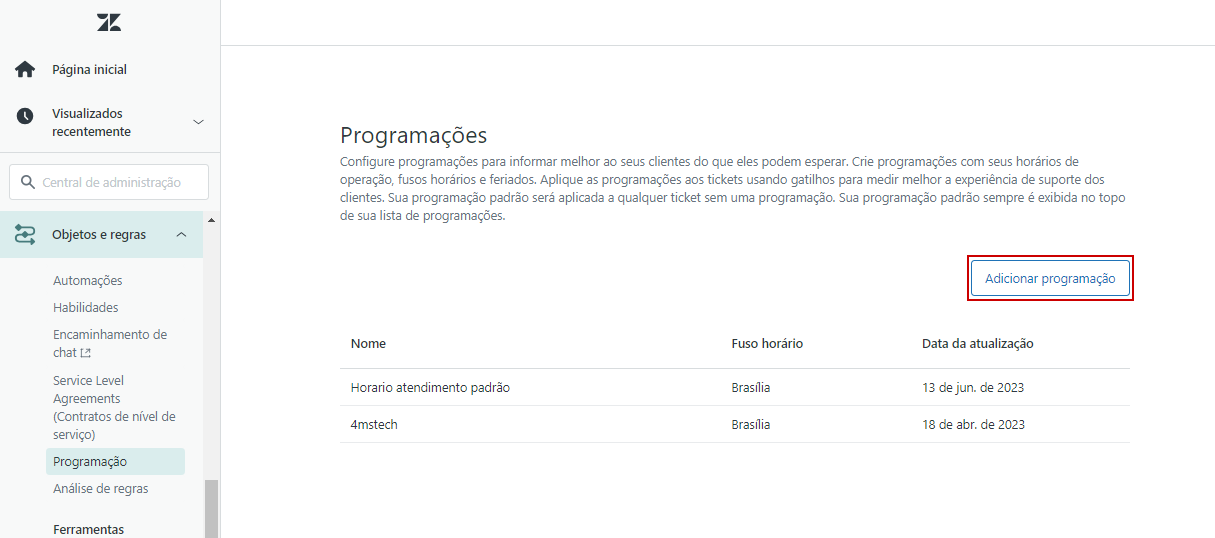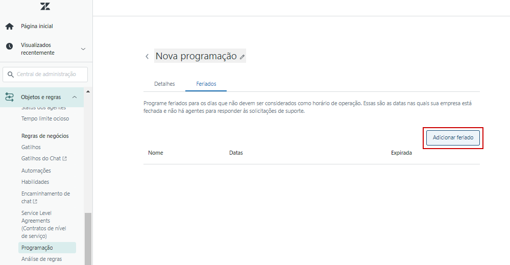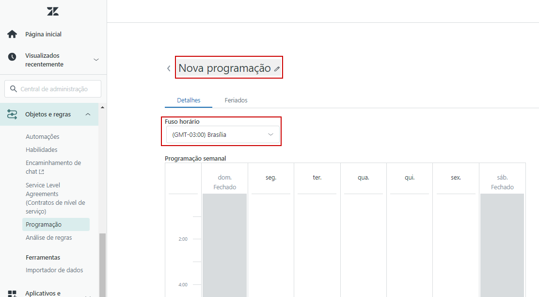 A programação de atendimento é definida em na instância da Zendesk a partir da configuração do horário de operação em cada dia da semana e em feriados. Dessa forma, a empresa abre espaço para uma experiência positiva com os clientes que enviarem tickets fora do horário de expediente, alinhando a expectativa sobre o prazo para resposta por meio de gatilhos.