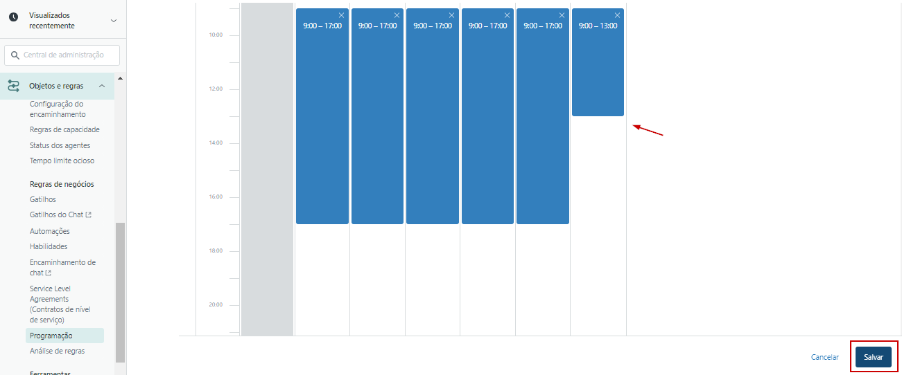 5) No campo Programação semanal será definido o horário de atendimento para cada dia. Clique em Salvar para criar a programação.