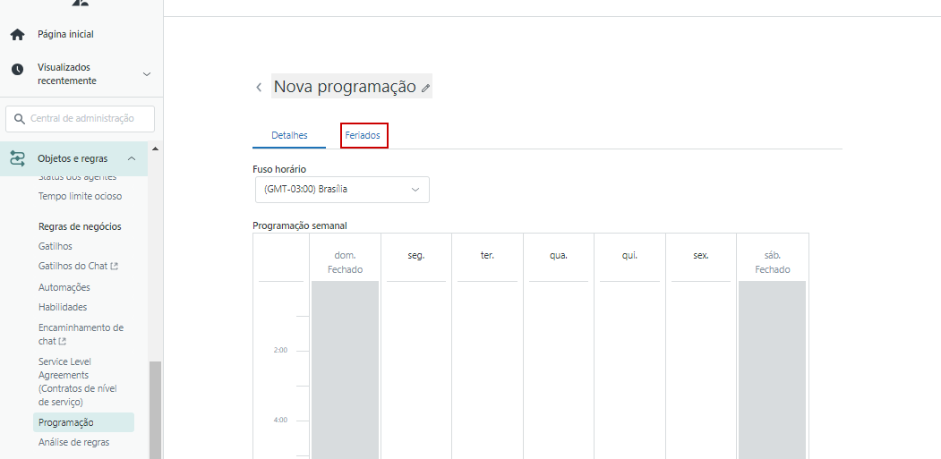 A configuração de Programação de atendimento possibilita que a empresa sinalize a disponibilidade da equipe no momento em que o ticket é criado, gerando melhor visibilidade sobre o prazo a partir do qual o cliente receberá o retorno. Os tickets recebidos fora do horário de atendimento podem ser trabalhados, inclusive, com métricas diferentes das aplicadas aos pedidos de suporte recebidos em horário de operação.