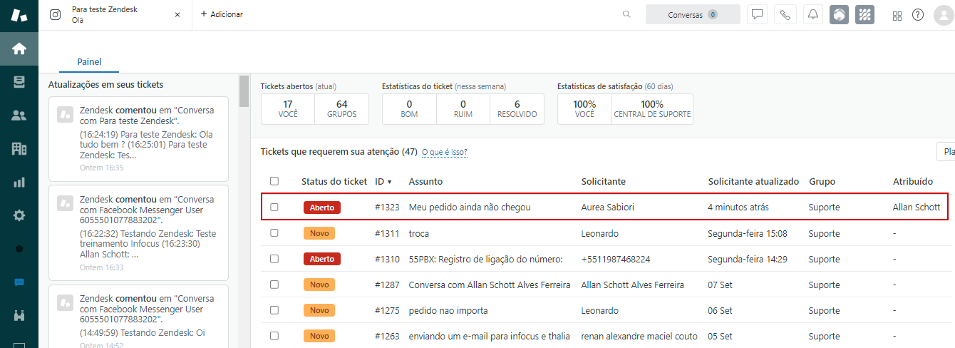 1) Ao acessar a interface da Zendesk Support, escolha um ticket para realizar o tratamento.