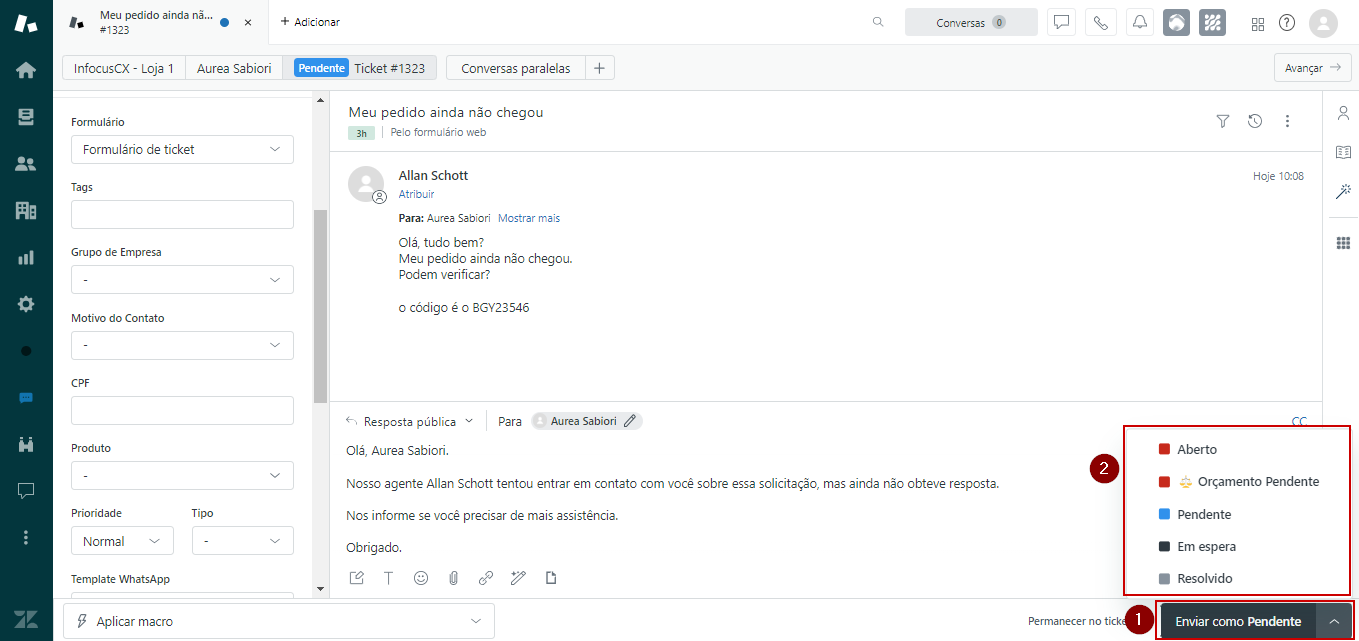 4) Atualize o status no ticket para ativar o conteúdo da macro selecionada. Clique então no menu Enviar como, indicando o respectivo status do atendimento.