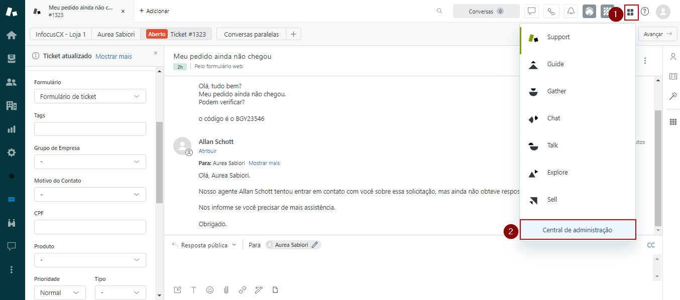 5) Para criar uma Macro, acesse a Guia de Produtos Zendesk e selecione Central de administração.