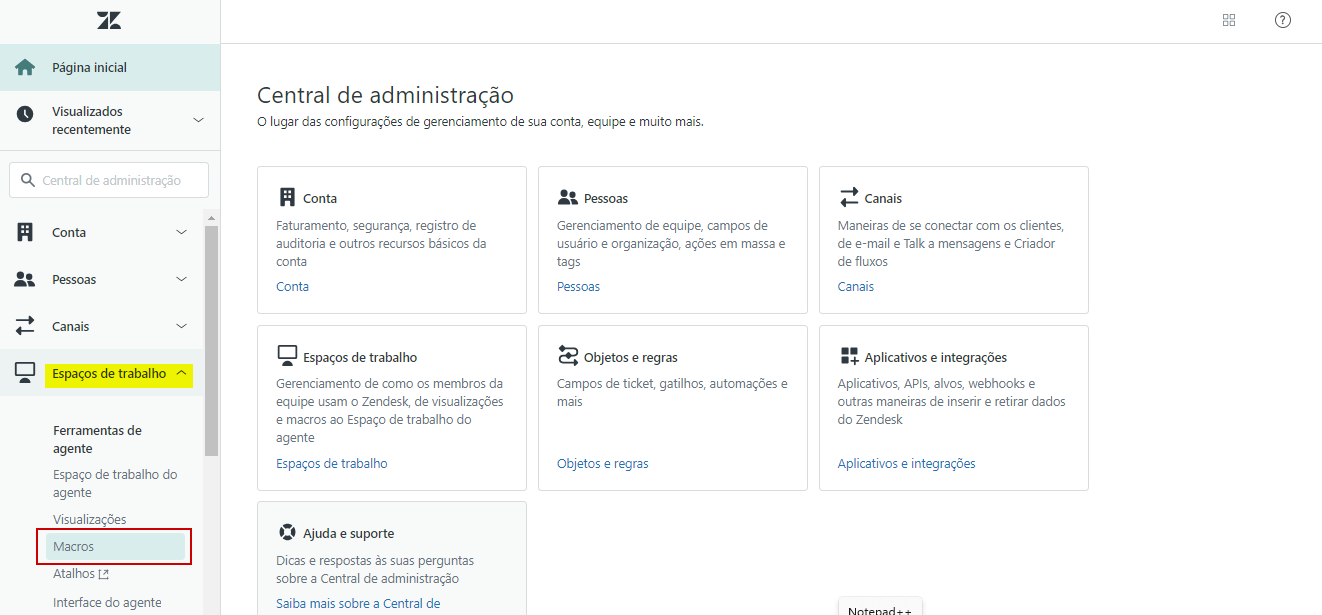 A utilização e a criação de macros são feitas no Support | Espaço de trabalho do agente. O processo é simples, conforme descrito no passo a passo: