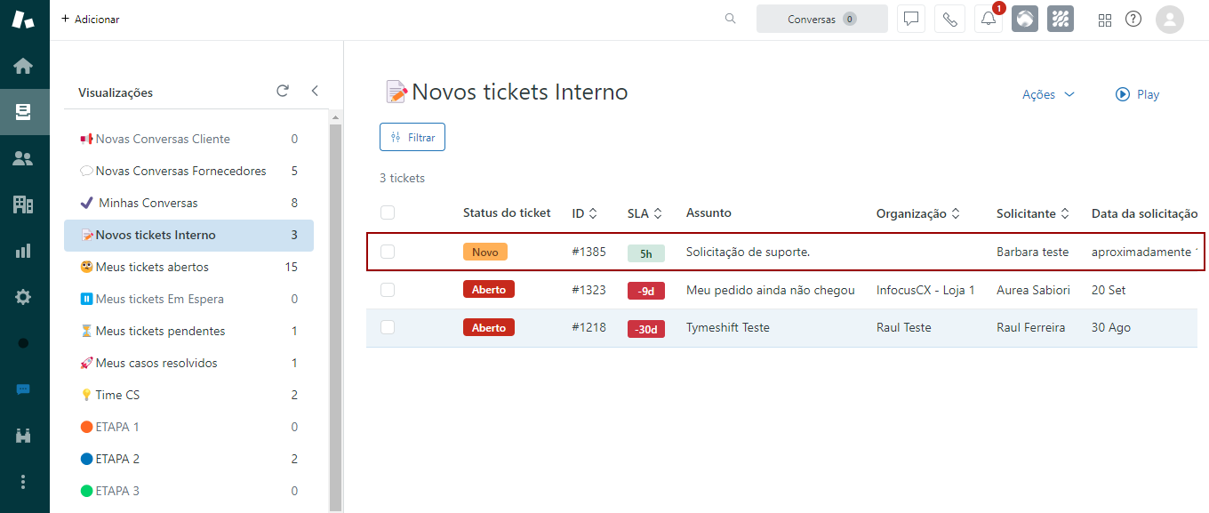 1) Selecione a visualização desejada e escolha um ticket para iniciar o tratamento.