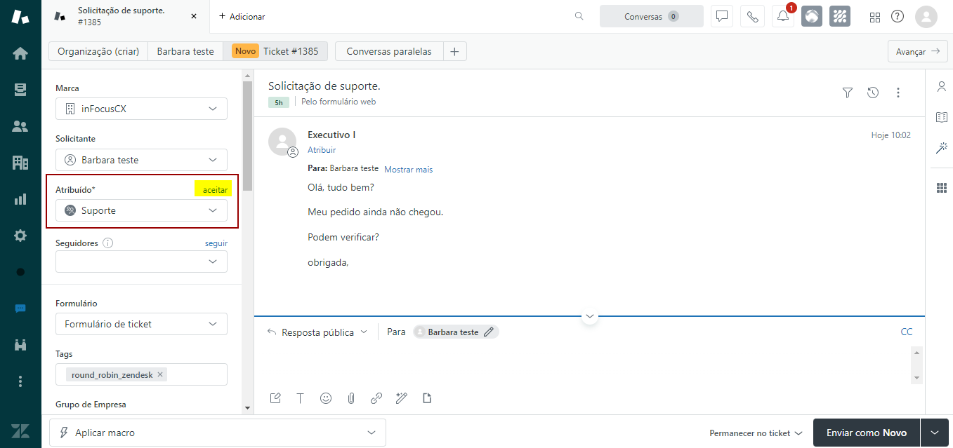 3) Para atribuir este ticket a você, clique em Aceitar.