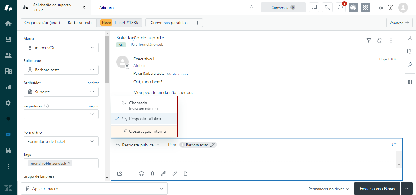 5) Uma informação pode ser registrada nesse campo de texto de duas maneiras. Utilize Resposta pública para enviar uma mensagem ao solicitante, e observação interna para registrar informações relevantes do histórico do atendimento, que serão visualizadas apenas pelos membros de equipe.