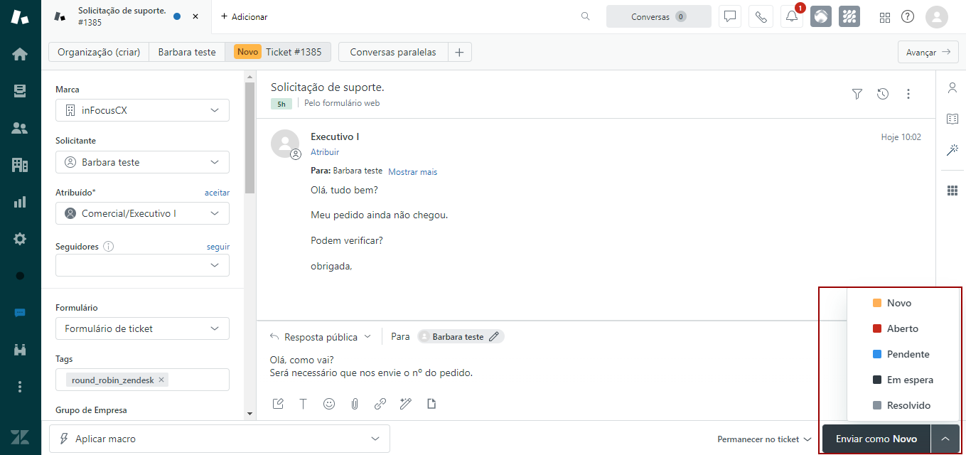 2) Ao acessar o ticket, será possível visualizar o nome do solicitante e a sua respectiva organização, caso ele faça parte de alguma registrada no seu Zendesk.